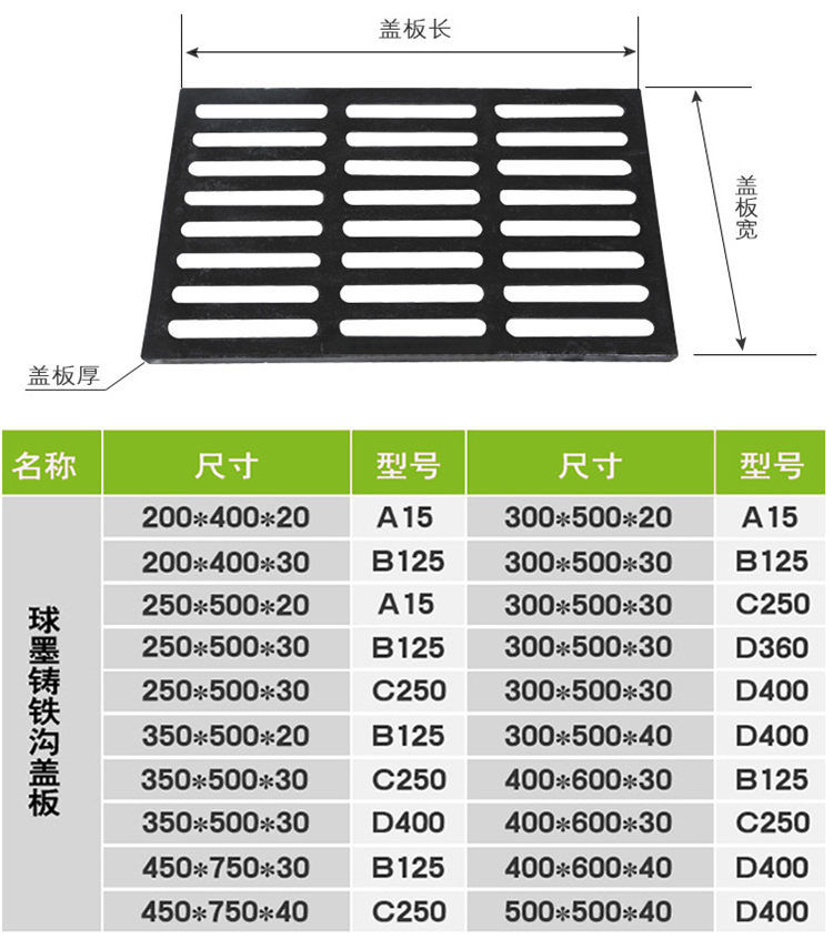 用途:主要用于市政道路和一般道路的排水設(shè)施,工廠排水溝蓋,地下室排水溝、一般建筑排水設(shè)施及檢查井設(shè)施。